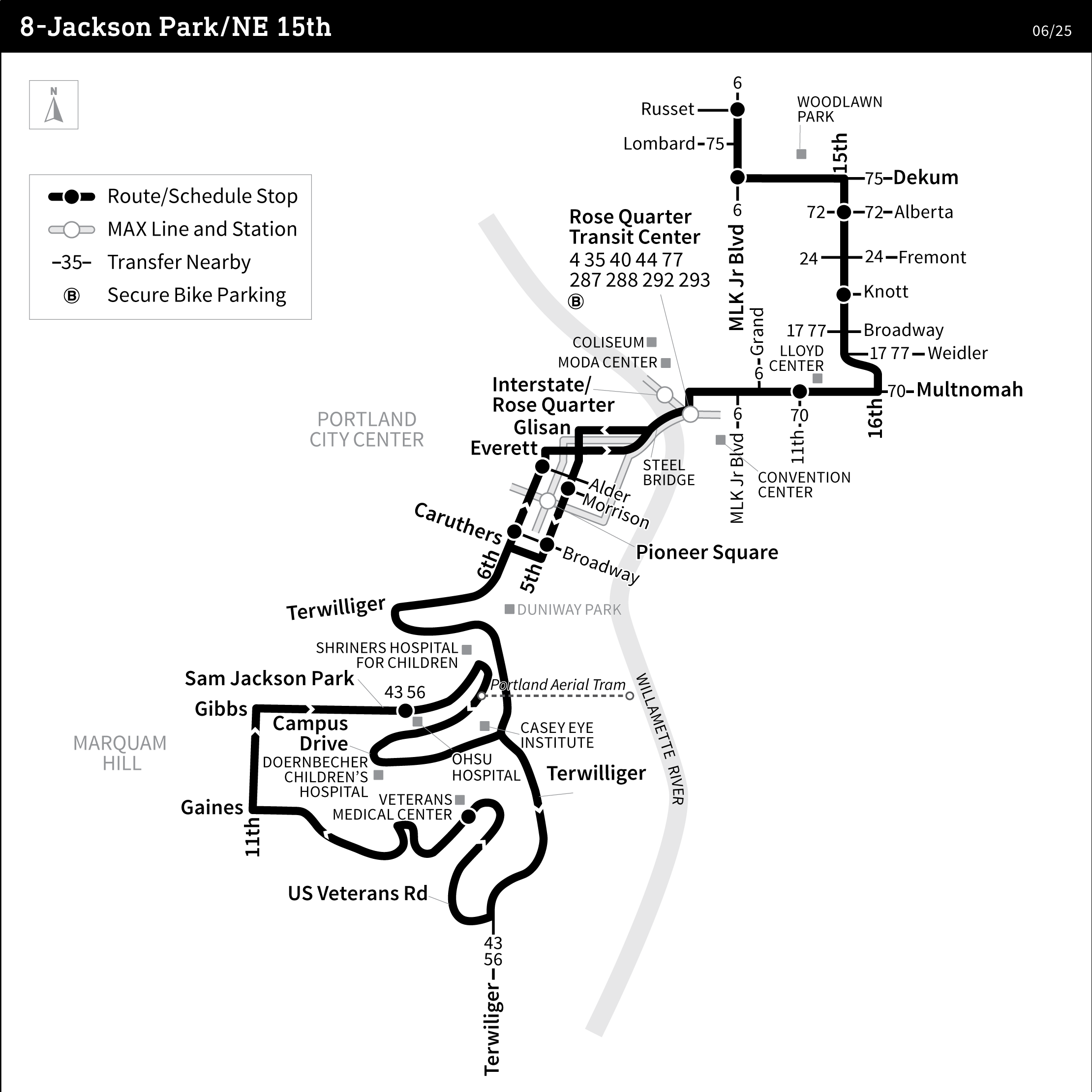 8-Jackson Park/NE 15th connects Marquam Hill, Portland City Center, Old Town/Chinatown, Union Station, the Rose Quarter, Lloyd Center, Irvington, NE Portland and the Woodlawn neighborhood, via Terwilliger, 5th/6th, Everett/Glisan, Multnomah, 15th, and Dekum.
