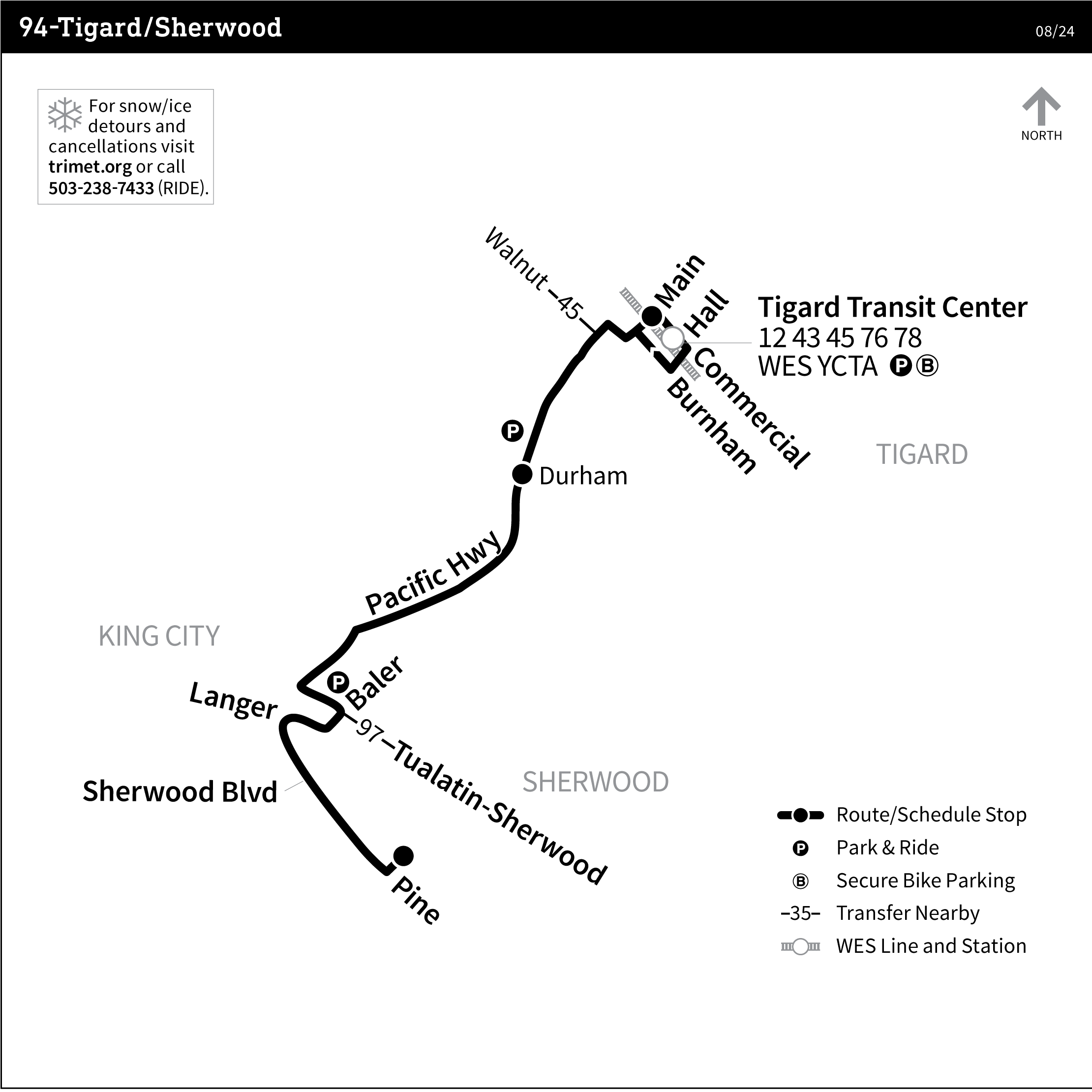 94-Tigard/Sherwood provides daily local service between Sherwood and Tigard.